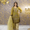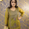 Step into elegance with our Elegant Tissue Shirt Set. Meticulously designed, this ensemble features delicate Zari Thread Nug And Mirror work that adds a touch of refinement. The straight-waisted shirt pairs seamlessly with a Banarsi Plazo, while the Organza Check Dupatta with 2.5 yards length showcases a 4-side border, enhancing the ensemble’s allure.